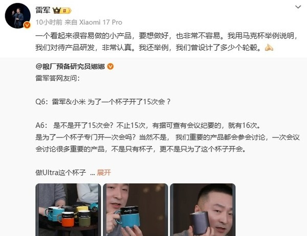 “一个看起来很容易做的小产品,要想做好,也非常不容易。”雷军在社交平台上以此为例,阐述小米的产品研发精神。他强调,公司对待任何产品都非常认真,这种态度不仅体现在汽车、手机等核心业务上,也贯穿于像马克杯这样的周边配件中。他进一步举例,小米汽车曾为轮毂设计过大量方案,以说明对细节的极致追求是其一贯风格。