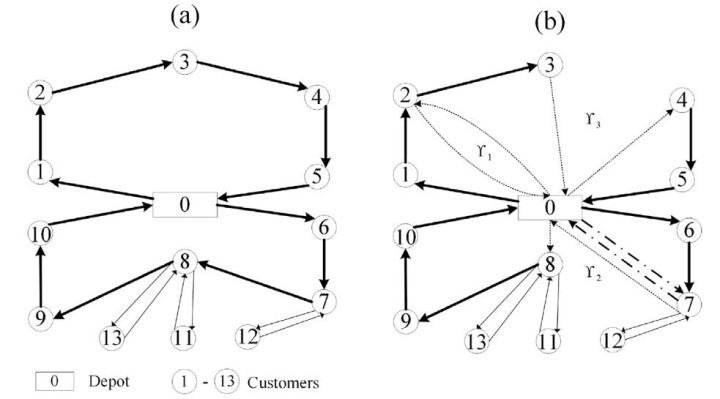 如图2(a)所示,路径0-1-2-3-4-5-0是一条不使用无人机的卡车路径;路径0-6-7-8-9-10-0是另一条多次使用无人机的卡车路径;7-12-7、8-11-8和8-13-8是从卡车发射的无人机路径。客户7和8同时作为LRS。