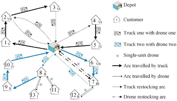 图1提供了TDRP-SD的一个描述性示例。场景中有13个需要服务的客户,每个客户的需求在卡车到达时才会揭示(图中用罗马数字表示)。卡车和无人机的最大容量分别为X和III单位。系统使用两辆各配备一架无人机的卡车和一架单机无人机来服务这13个客户。