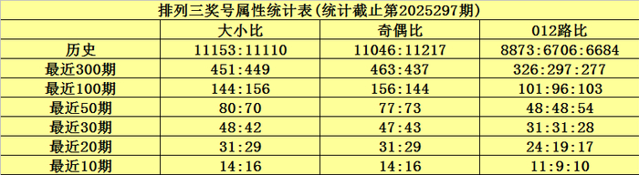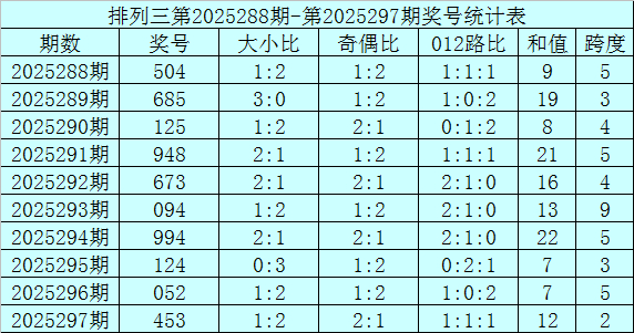 上期回顾:排列三第2025297期奖号为453,奖号012路比为1:1:1,奇偶比为2:1,大小比为1:2,和值为12,跨度为2。