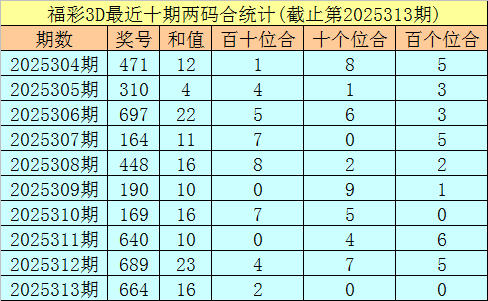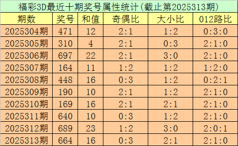 开奖回顾:第2025313期福彩3D奖号为664。奖号形态为组三,大小比为2:1,和值为16,奇偶比为0:3,012路比为2:1:0,跨度为2。