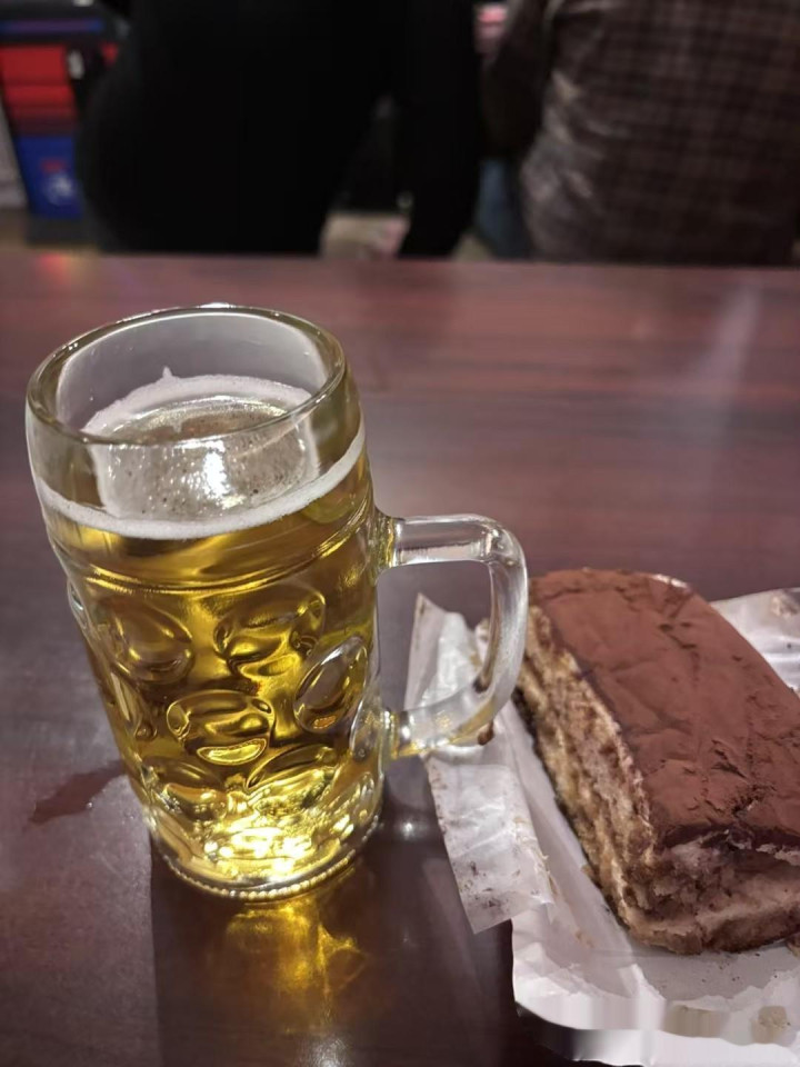 在德国还是要喝下啤酒的,夜宵提拉米苏配啤酒再加小黄瓜。德国这种啤酒喝着比较顺口,太容易喝多,我看别人都是大杯子。