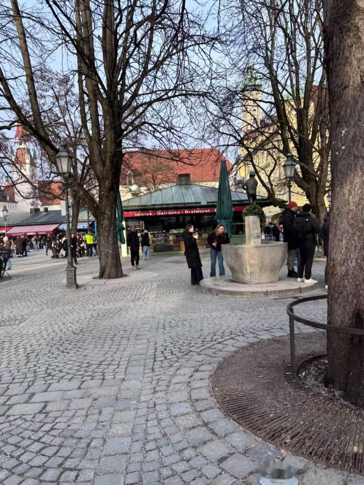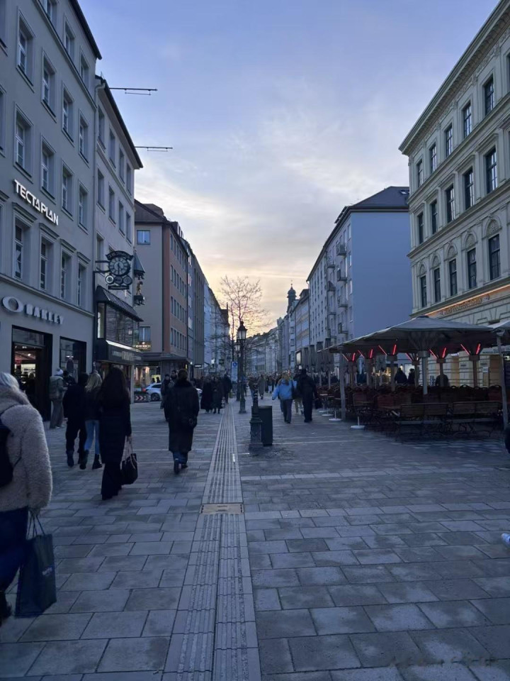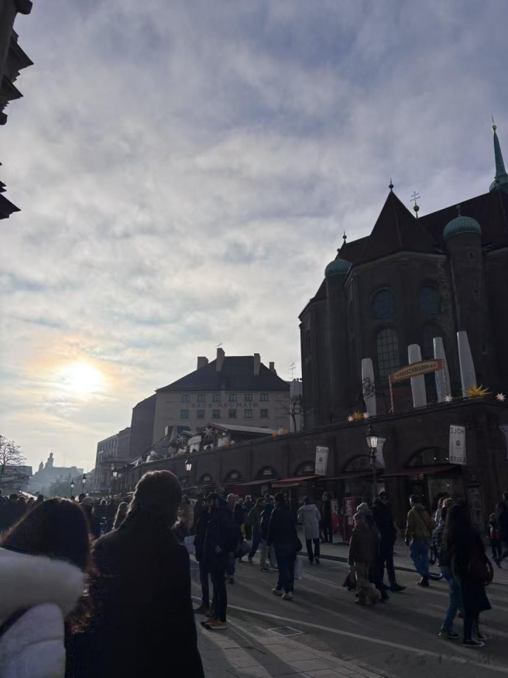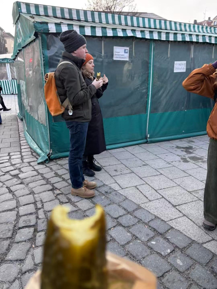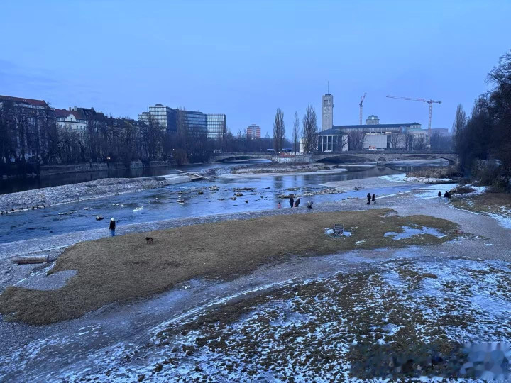 到傍晚就冷,路过上午到过的河边,河面结冰更重,每次看天气预报慕尼黑有零下20多度,别人手机是零下7度,对这个地方气候拿不准。人到这里了,显示1度,总的来说天气比我想的好。
