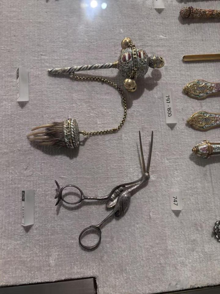 珍贵的文物,价值连城,有水晶系列的,也有玩具,靠前挂个东西的是小孩拨浪鼓,挂的东西避邪,当然是贵族小孩的。下面那个像鸭子嘴的是夹方糖的,鸟肚子中还有个小孩,和民间故事有关,这么精致的架子也是礼物。
